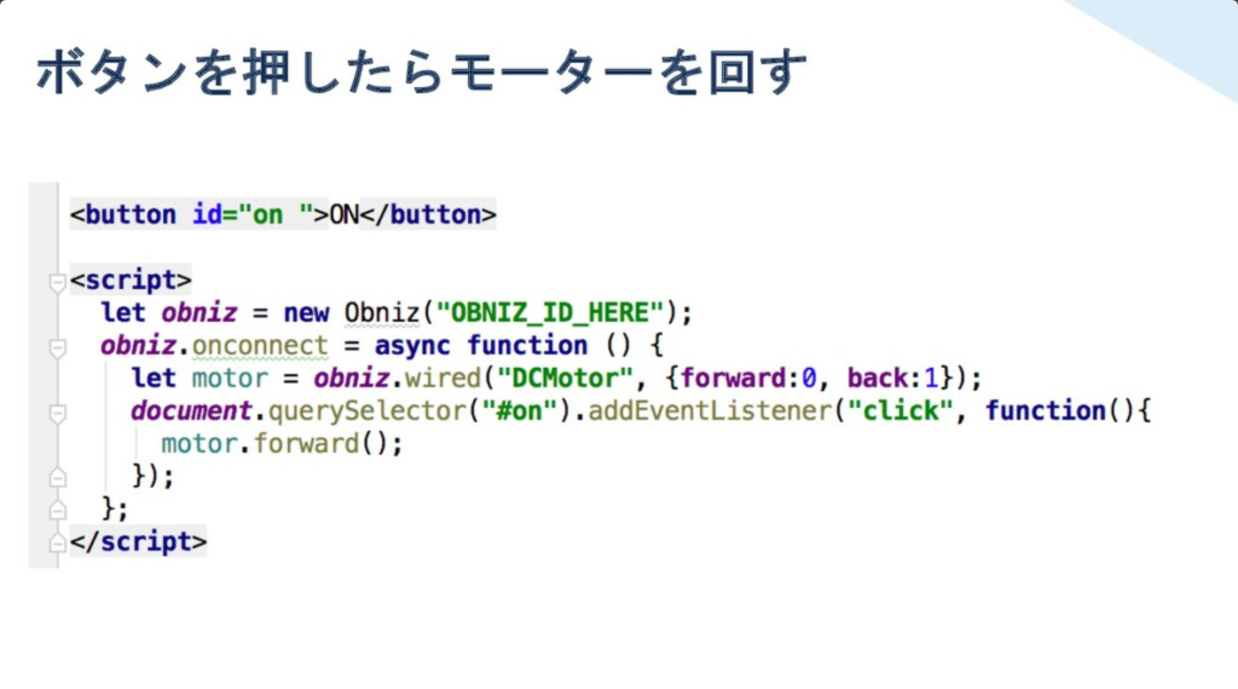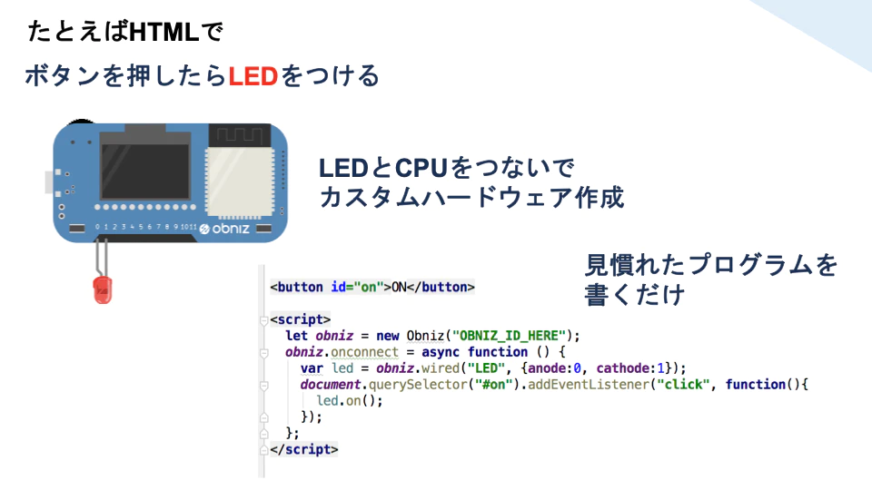 위 슬라이드는 HTML에서 버튼을 누르면 obniz에 연결된 LED가 켜지는 코드를 보여주고 있다. obniz가 연결되면 obniz 객체에서 기기에 연결된 led 객체를 가져오고, 버튼을 누르면 led.on을 실행하는 간단한 코드이다.