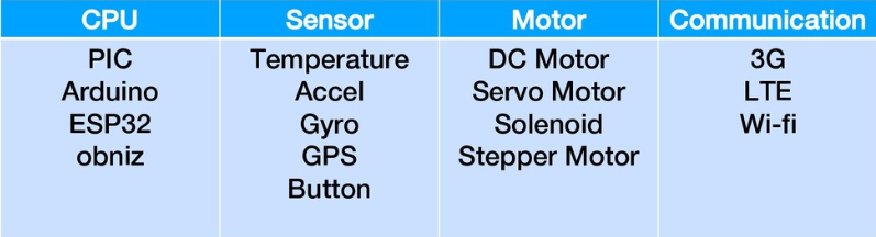 결국 제대로 IoT를 만들고 싶다면 커스텀 하드웨어를 만들어야 한다. 하드웨어는 몇가지 부품을 조립하면 만들 수 있는 간단한 조립 컴퓨터라고 생각하면 쉽다. 부품은 크게 4가지로 구분할 수 있다.